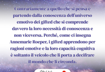 Essere gifted è complesso e allo stesso tempo terribilmente affascinante. Essere gifted non vuole necessariamente dire avere un talento. Essere gifted vuol dire vedere il mondo con occhi e profondità diversi, vuol dire andare al di là degli schemi, vuol dire provare sensazioni che pochi riescono a provare.